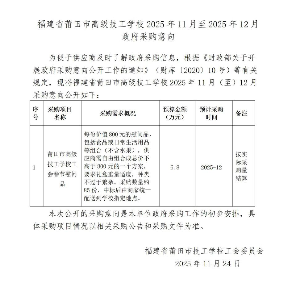 福建省莆田市高级技工学校2025年11月至2025年12月政府采购意向